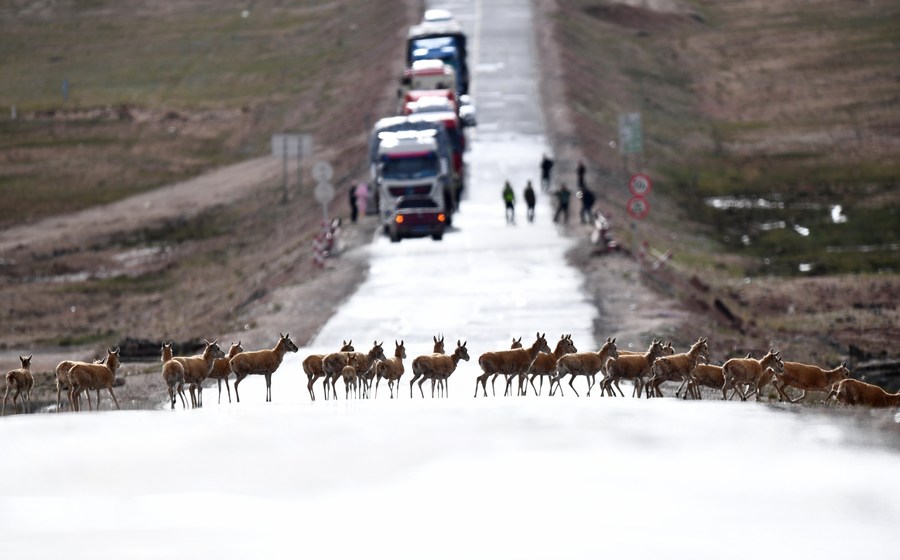 Grupa antylop tybetańskich przechodzi przez drogę Qinghai-Tybet i kieruje się w stronę obszaru Sanjiangyuan w prowincji Qinghai w północno-zachodnich Chinach, 28 lipca 2023 r. (Xinhua/Zhang Hongxiang).