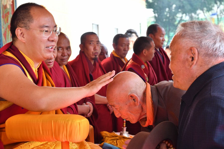 Panczen Erdeni Chos-kyi rGyal-po udziela błogosławieństwa wiernemu w Lhasie, w Tybetańskim Regionie Autonomicznym, 17 lipca 2023 r. (Zdjęcie: Chogo/Xinhua)