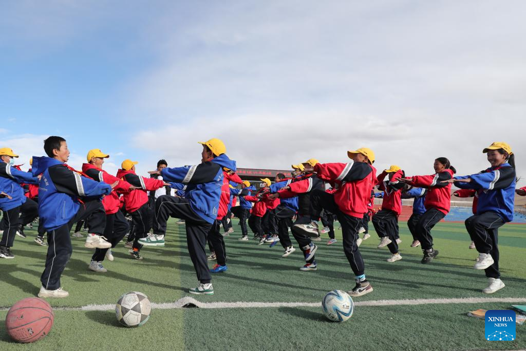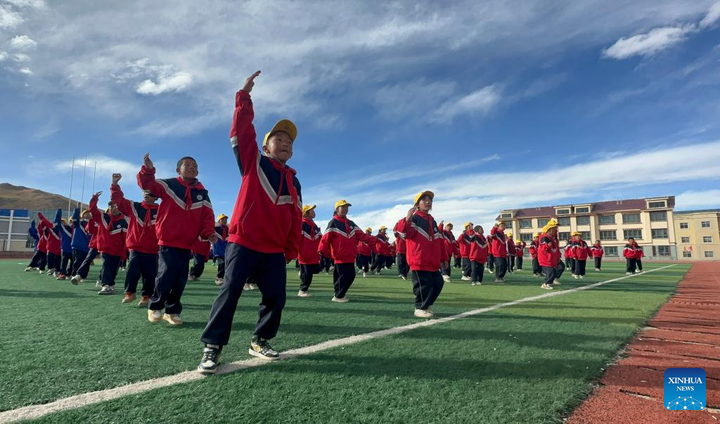 Uczniowie uprawiają sport na placu zabaw w szkole podstawowej Sinopec powiatu Baingoin w siedzibie powiatu Baingoin w prefekturze Nagqu, w Tybetańskim Regionie Autonomicznym w, 13 października 2023 r. (Zdjęcie: Wang Jing/Xinhua)
