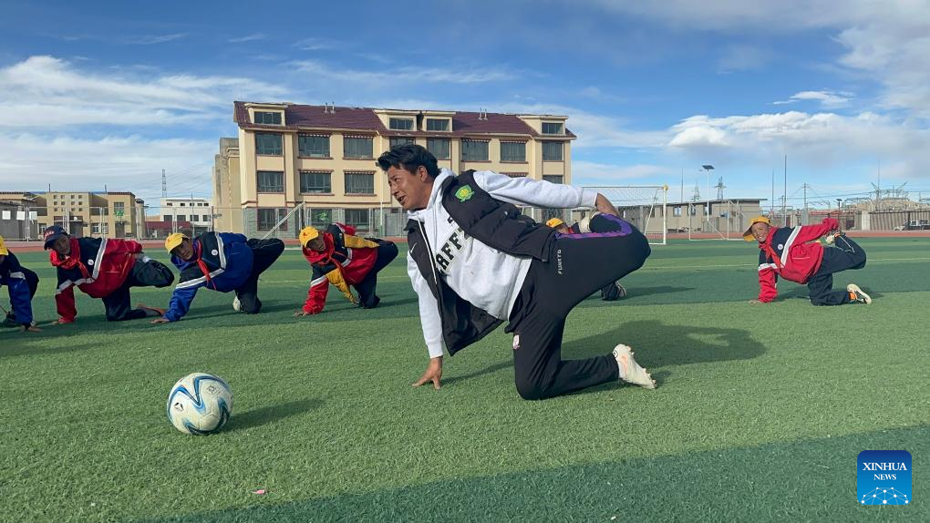 Nauczyciel demonstruje, jak uczniowie uprawiają sport na placu zabaw szkoły podstawowej Sinopec powiatu Baingoin w siedzibie powiatu Baingoin w prefekturze Nagqu, w Tybetańskim Regionie Autonomicznym w, 13 października 2023 r. (Zdjęcie: Kong Linlin/Xinhua)