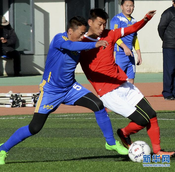Na fotografii reprezentanci drużyn z Lhasy i Nyingchi w walce o piłkę w trakcie meczu inaugurującego turniej w dniu 24 grudnia 2016 roku [Photo / Xinhua]