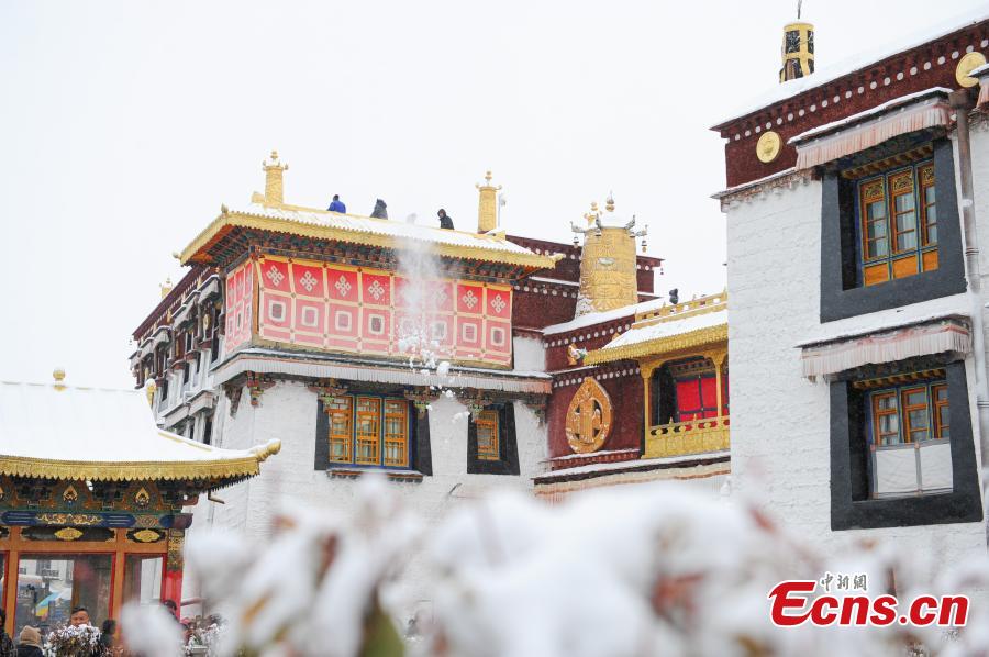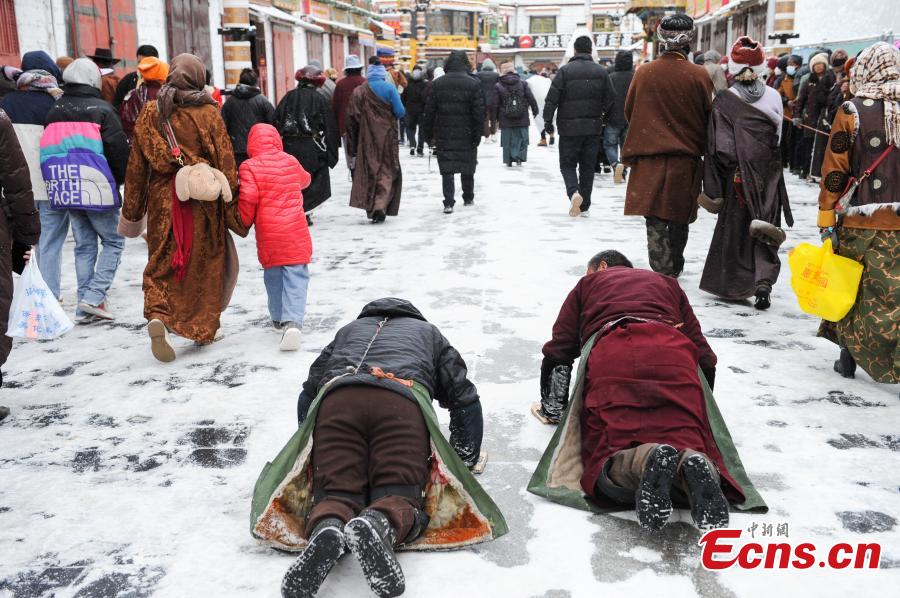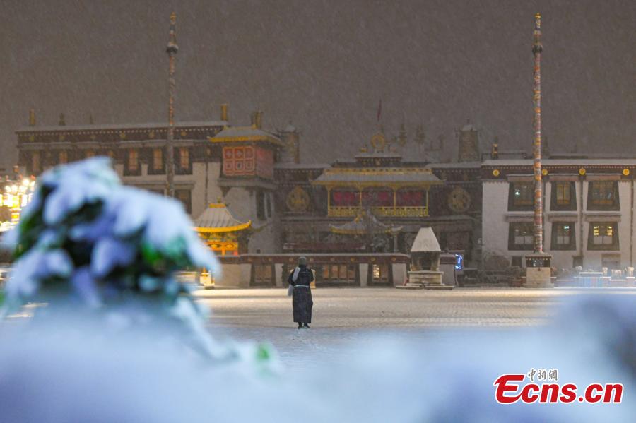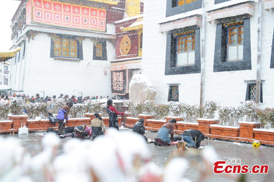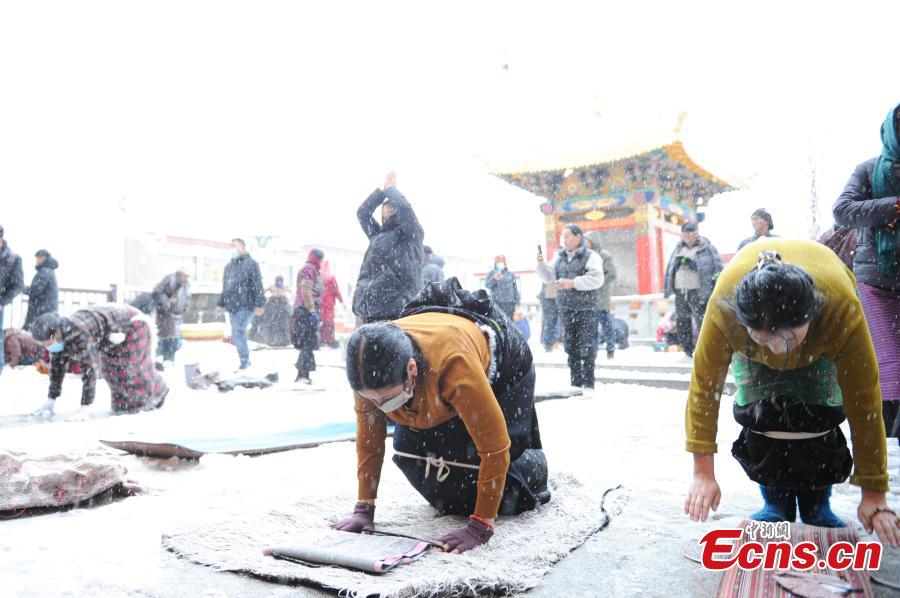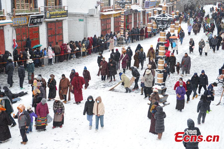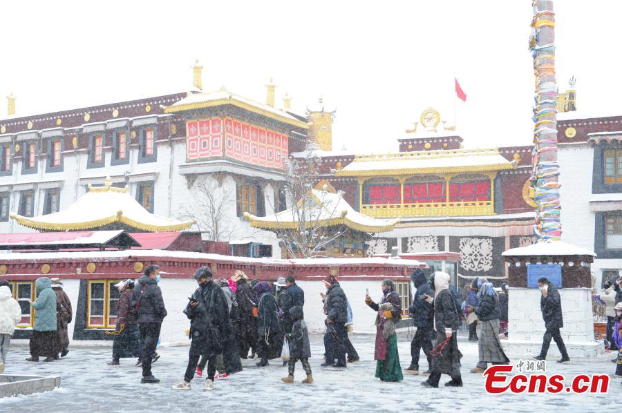 Tybetańscy pielgrzymi modlą się przed świątynią Jokhang po opadach śniegu w Lhasie, 18 stycznia 2024 r. (Photo/China News Service)