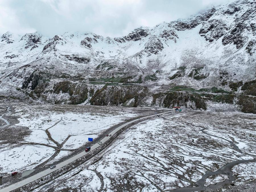 To zdjęcie lotnicze wykonane 15 października 2023 r. przedstawia wyjazd z tunelu z autostrady łączącej Bome z Medog w Tybetańskim Regionie Autonomicznym. (Xinhua/Sun Fei).
