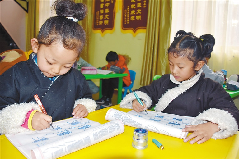 Jampa Yangtso i jej mała siostrzyczka Baikyi ćwiczą tybetańską kaligrafię. [Foto/China Tibet News]