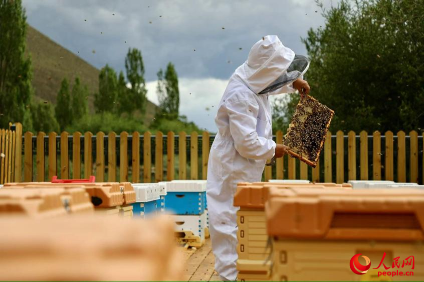 Pszczelarz sprawdza rozwój pszczół miodnych na farmie pszczół w Shannan w w Tybetańskim Regionie Autonomicznym. (Foto: People’s Daily Online/Tsering Norbu).