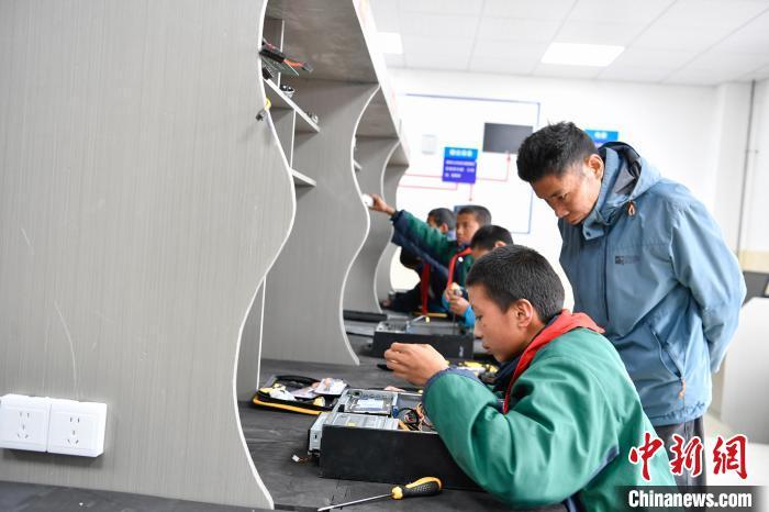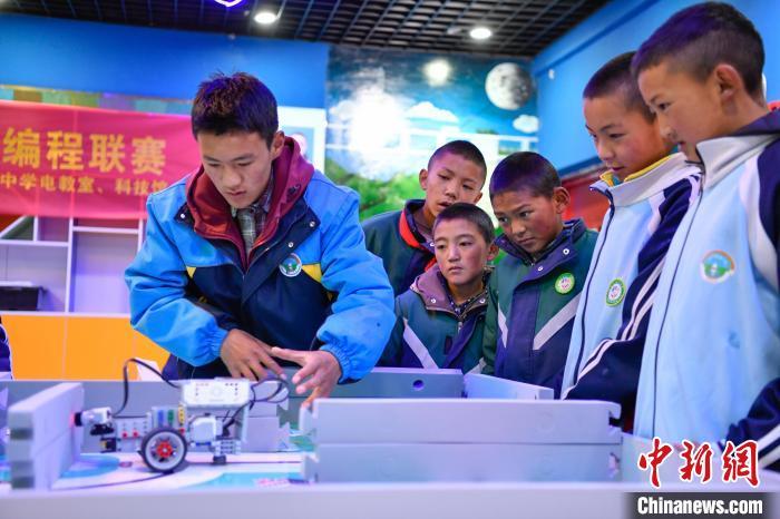Na zdjęciu uczniowie szkoły średniej powiatu Nyainrong prezentują swoje prace z zakresu programowania komputerów.