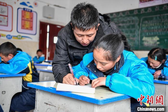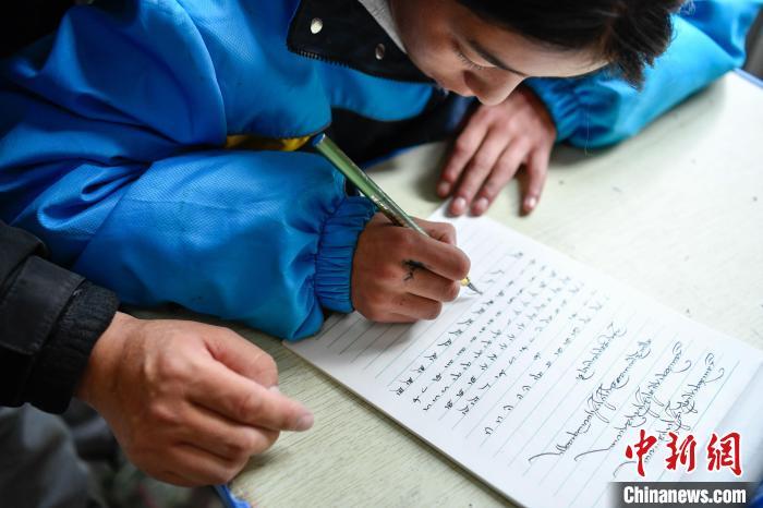Na zdjęciu uczniowie szkoły średniej powiatu Nyainrong pod kierownictwem swojego nauczyciela uczą się kaligrafii tybetańskiej.