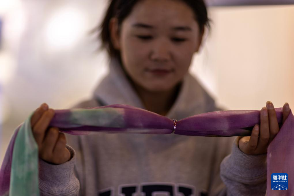 Pracownica Centrum Wystawienniczego Białego Kaszmiru w powiecie Ritu/Rutog prezentuje „Szal pierścieniowy” (zdjęcie zrobione 16 listopada). [Agencja Informacyjna Xinhua/Jiang Fan]