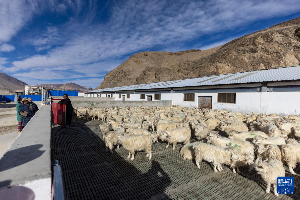 Pracownicy ośrodka hodowli oryginalnych białych kóz kaszmirowych w powiecie Ritu opiekują się rasowymi zwierzętami (zdjęcie zrobione 16 listopada). [Agencja Informacyjna Xinhua/Jiang Fan]
