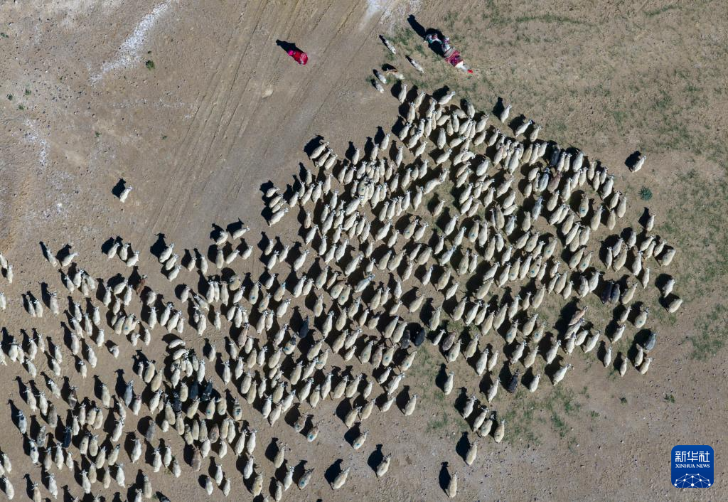 Pasterze w powiecie Ritu wypasają białe kozy kaszmirowe (zdjęcie z drona, zrobione 21 września 2023 r.). [Agencja Informacyjna Xinhua/Jiang Fan]