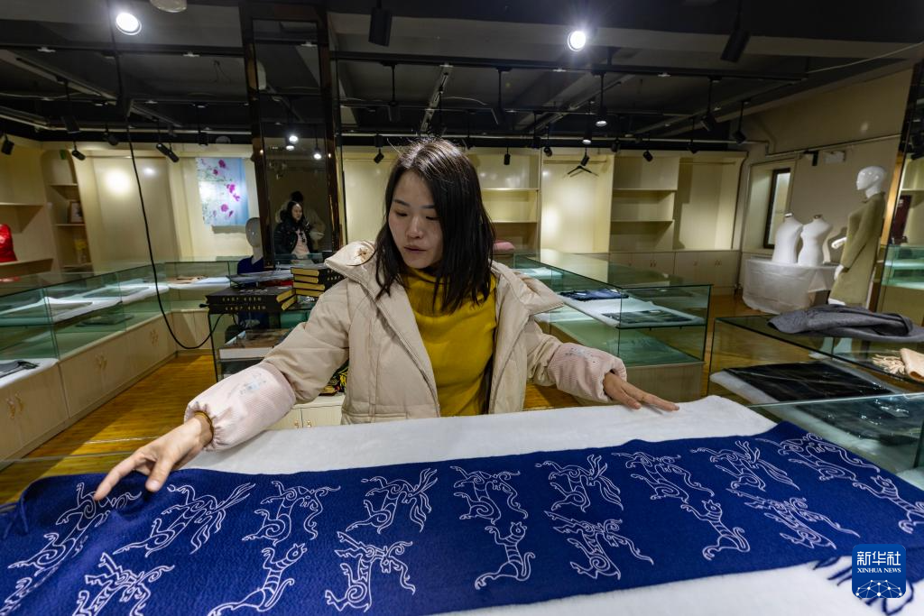 Pracownica Centrum Wystawienniczego Białego Kaszmiru w powiecie Ritu prezentuje „szal pierścieniowy” z nadrukiem rysunków naskalnych Ritu - wielkiej historycznej [Agencja Informacyjna Xinhua/Jiang Fan]