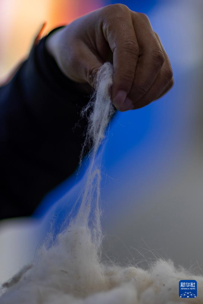 Bajiu, dyrektor hodowli oryginalnych białych kóz kaszmirowych w powiecie Ritu, prezentuje próbki białego kaszmiru (zdjęcie zrobione 16 listopada). [Agencja Informacyjna Xinhua/Jiang Fan]
