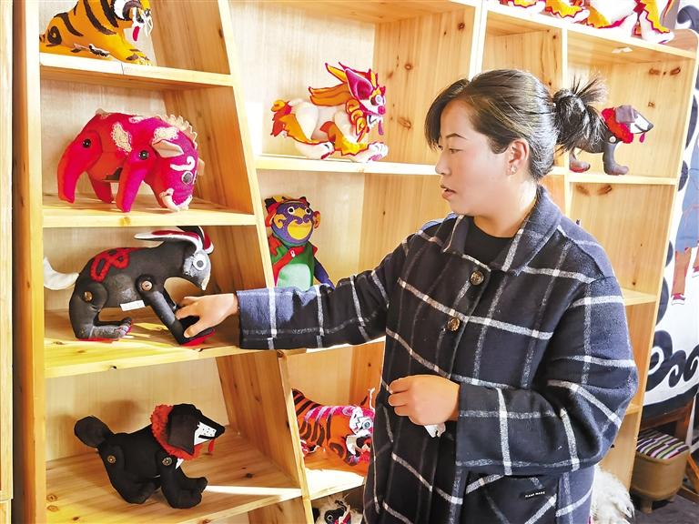 Pracownica prezentuje ręcznie robione lalki - znaki zodiaku. [Zdjęcie: reporter Wang Min]