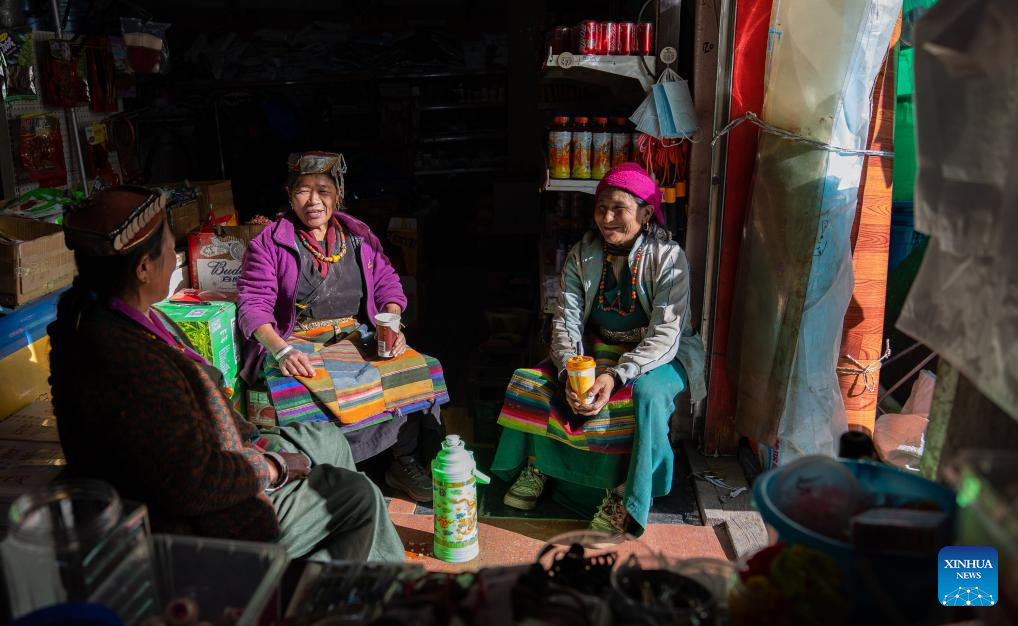 Kobiety Sherpa rozmawiają ze sobą pijąc herbatę z mlekiem - gmina Zhentang, powiat Dinggye w Xigaze, w Tybetańskim Regionie Autonomicznym, 13 grudnia 2024 r. (Xinhua/Tenzin Nyida)