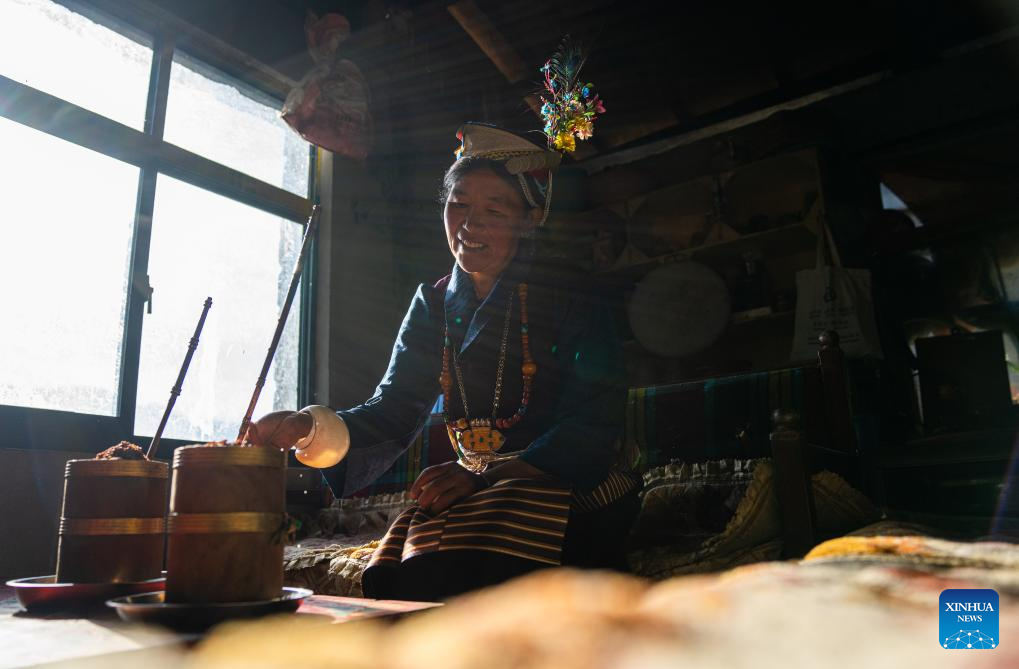 Kobieta Sherpa przygotowuje lokalne wino dla gości w gminie Zhentang, powiat Dinggye w Xigaze, w Tybetańskim Regionie Autonomicznym [Xizang], 13 grudnia 2024 r. (Xinhua/Tenzin Nyida)