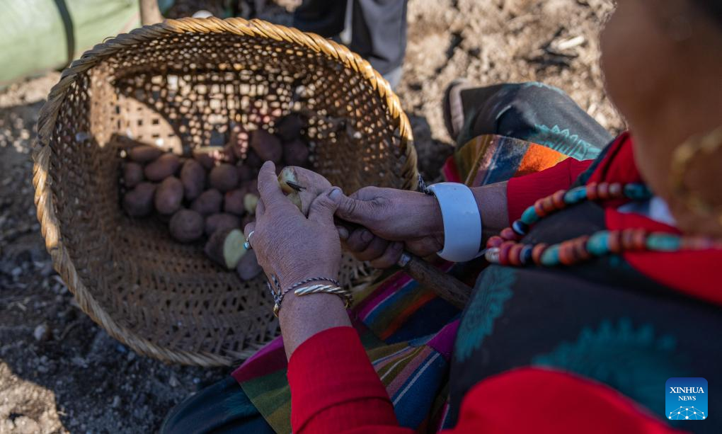 Namkha, kontynuatorka tradycji tańca Zhentang Sherpa, zapisanego w centralnym spisie niematerialnego dziedzictwa kulturowego Chin, kroi ziemniaki, 13 grudnia 2024 r. (Xinhua/Tenzin Nyida)