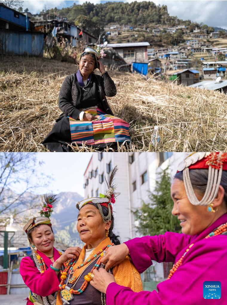 To podwójne zdjęcie przedstawia Namkha, kontynuatorkę tradycji tańca Zhentang Sherpa, zapisanego w centralnym spisie niematerialnego dziedzictwa kulturowego Chin, poprawiającą nakrycie głowy podczas występu 27 listopada 2021 r. (powyżej, zdjęcie autorstwa fotografa Xinhua Sun Ruibo) oraz dwie kobiety Sherpa pomagające Namkha założyć tradycyjne stroje 13 grudnia 2024 r. (zdjęcie autorstwa fotografa Xinhua Tenzin Nyida). (Xinhua)