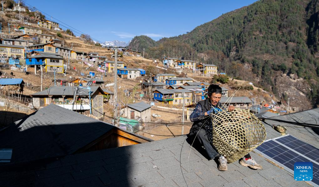 Mężczyzna z plemienia Sherpa wyplata bambusowe kosze na dachu swojego domu w Zhentang, 13 grudnia 2024 r. (Xinhua/Tenzin Nyida)