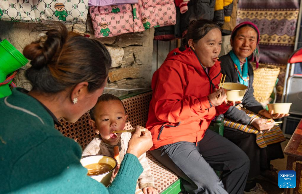 Sherpowie podczas śniadania - Zhentang, powiat Dinggye prefektura Xigaze, 13 grudnia 2024 r. (Xinhua/Tenzin Nyida)