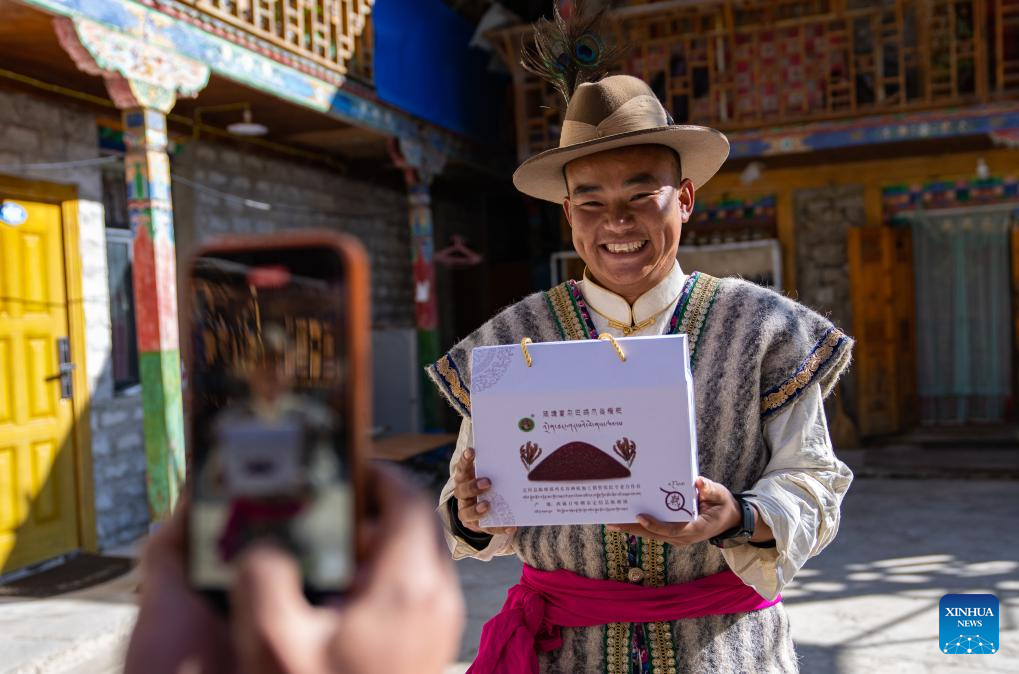 Bloger z plemienia Sherpa nagrywa film promujący lokalne produkty z Zhentang, 13 grudnia 2024 r. (Xinhua/Tenzin Nyida)