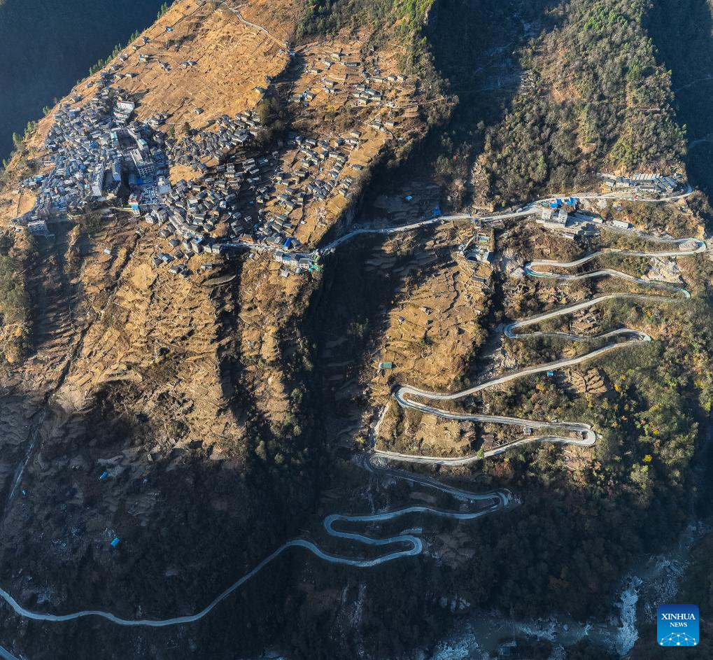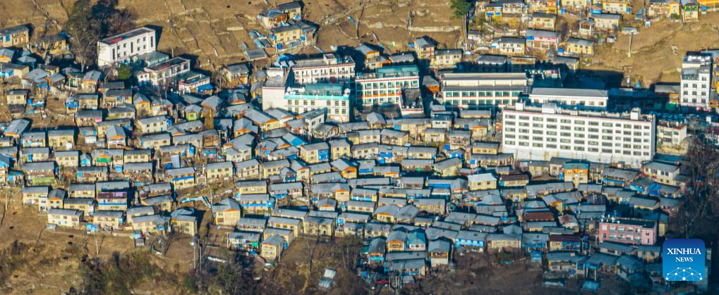 Zdjęcie lotnicze z drona wykonane 13 grudnia 2024 r. - widok na gminne miasteczko Zhentang, powiat Dinggye w Xigaze, w Tybetańskim Regionie Autonomicznym. (Xinhua/Tenzin Nyida)