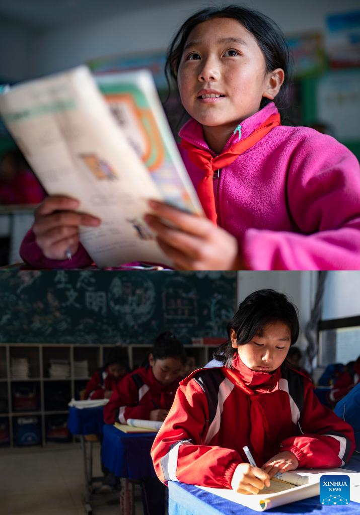Te dwie fotografie przedstawiają uczennicę z ludu Sherpów Wangmo. Na pierwszej Wangmo czyta podręcznik w klasie, 24 listopada 2021 r. (zdjęcie autorstwa fotografa Xinhua Purbu Zhaxi), poniżej Wangmo podczas lekcji matematyki w szóstej klasie w klasie 13 grudnia 2024 r. (zdjęcie autorstwa fotografa Xinhua Tenzin Nyida) w szkole w gminie Zhentang, powiat Dinggye prefektura Xigaze, w Tybetańskim Regionie Autonomicznym. (Xinhua)