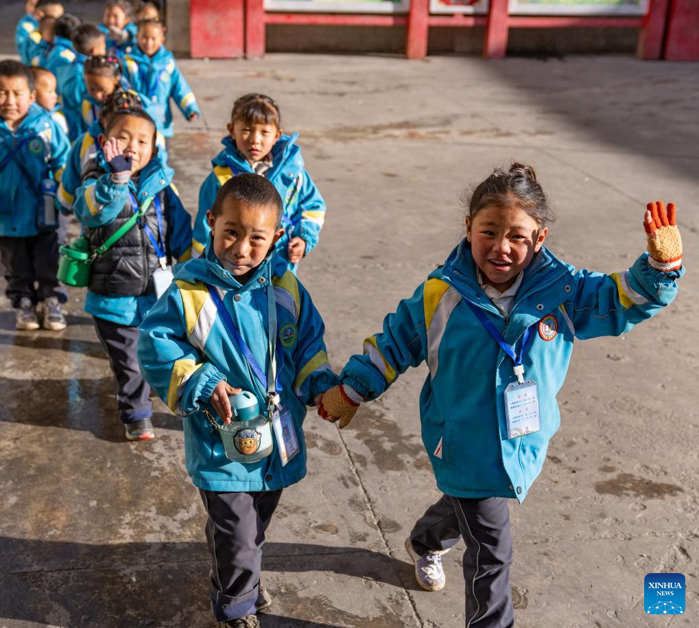 Dzieci Sherpa zmierzają do klasy przedszkola w gminie Zhentang, powiat Dinggye w Xigaze, 13 grudnia 2024 r. (Xinhua/Tenzin Nyida)