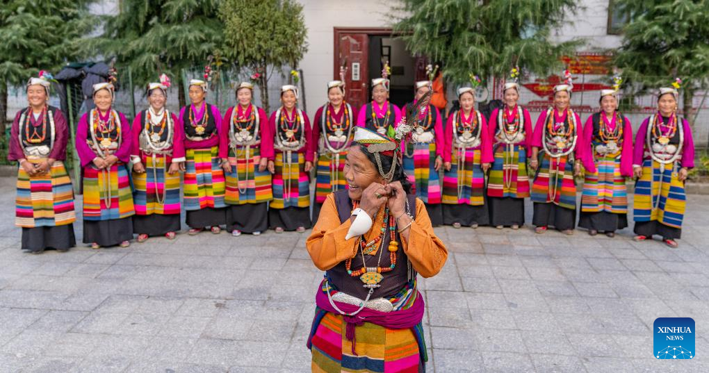 Namkha, kontynuatorka tradycji tańca Zhentang Sherpa, zapisanego w centralnym spisie niematerialnego dziedzictwa kulturowego Chin, pozuje do grupowego zdjęcia z kobietami Sherpa w gminie Zhentang, powiat Dinggye w Xigaze, w Tybetańskim Regionie Autonomicznym [Xizang], 13 grudnia 2024 r. (Xinhua/Tenzin Nyida)