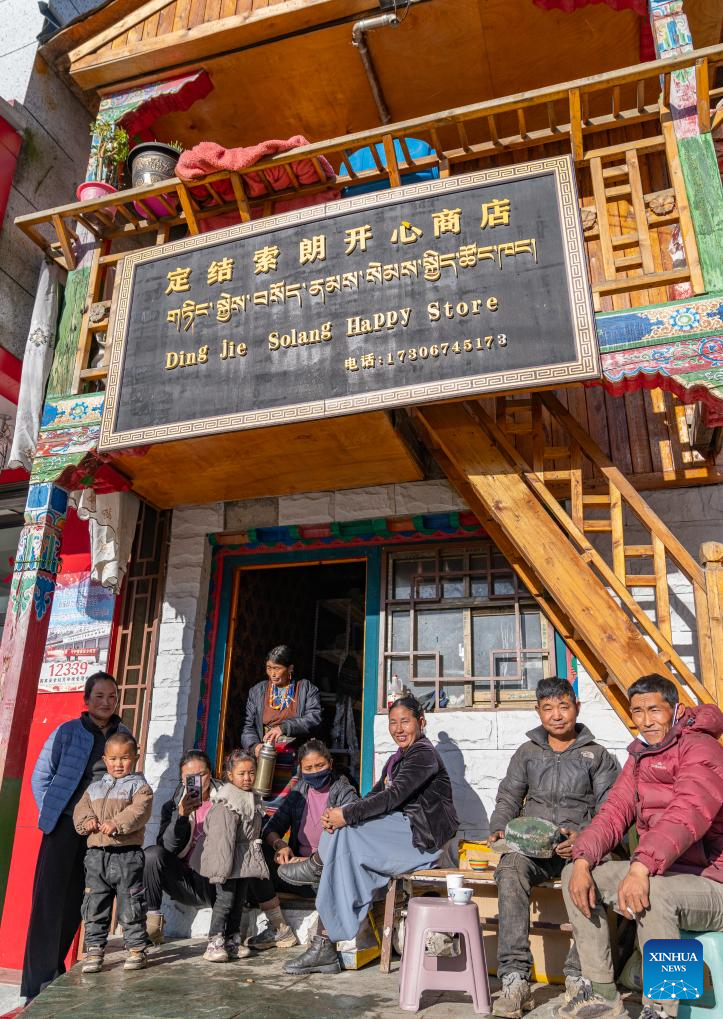 Sherpowie przed sklepem w gminie Zhentang, powiat Dinggye w Xigaze, w Tybetańskim Regionie Autonomicznym, 13 grudnia 2024 r. (Xinhua/Tenzin Nyida)