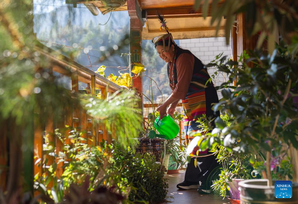 Kobieta Sherpa podlewa rośliny w swoim domu w gminie Zhentang, powiat Dinggye w Xigaze, w Tybetańskim Regionie Autonomicznym, 13 grudnia 2024 r. (Xinhua/Tenzin Nyida)