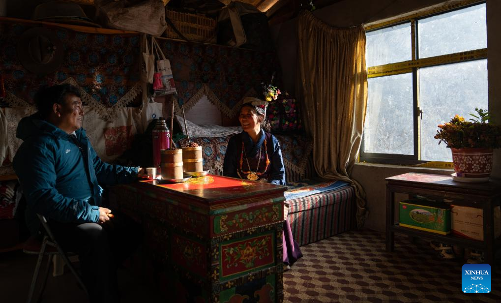 Kobieta Sherpa rozmawia z gościem w swoim domu w gminie Zhentang, powiat Dinggye w Xigaze, w Tybetańskim Regionie Autonomicznym, 13 grudnia 2024 r. (Xinhua/Tenzin Nyida)