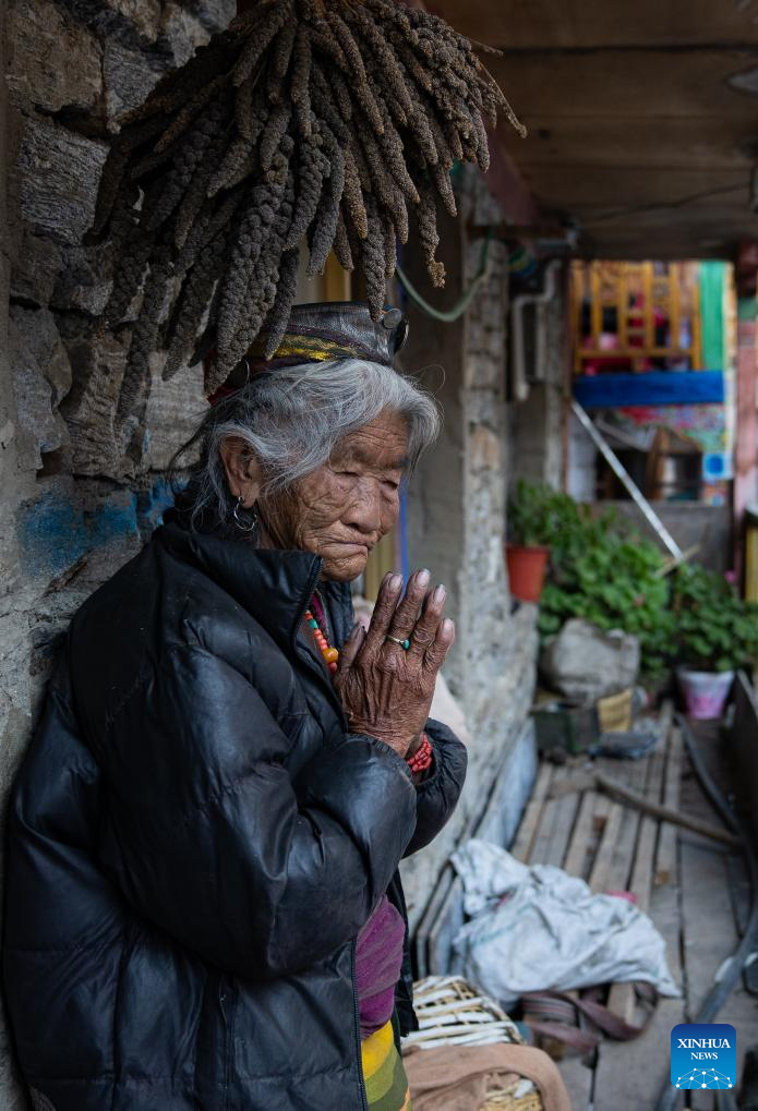 Stara kobieta Sherpa modli się na balkonie swojego domu w gminnym miasteczku Zhentang, powiat Dinggye w Xigaze, w Tybetańskim Regionie Autonomicznym, 13 grudnia 2024 r. (Xinhua/Tenzin Nyida)