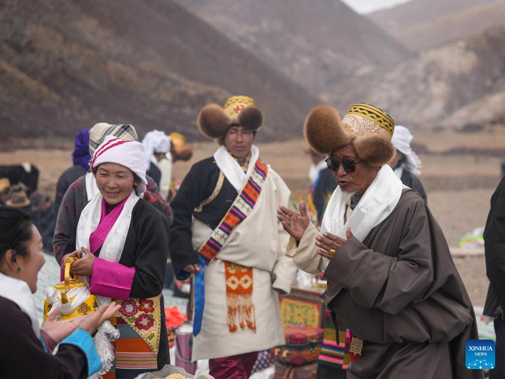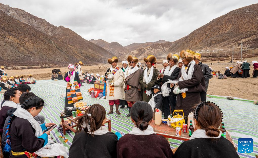 Wangchen (z prawej) wznosi toast i śpiewa dla gości podczas rytuału rozpoczynającego wiosenne prace rolnicze w powiecie Lhunzhub w Lhasie, w południowo-zachodnim Tybetańskim Regionie Autonomicznym [Xizang] w Chinach, 16 marca 2025 r. (Xinhua/Jigme Dorje)