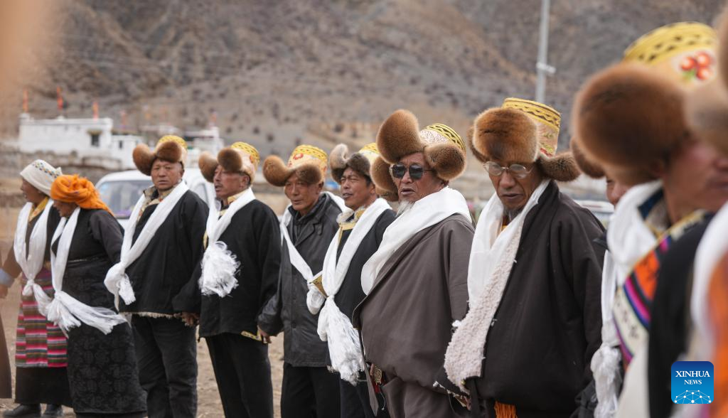 Wangchen (siódmy od lewej) śpiewa podczas rytuału rozpoczynającego wiosenne prace rolnicze w powiecie Lhunzhub w Lhasie, w południowo-zachodnim Tybetańskim Regionie Autonomicznym [Xizang] w Chinach, 16 marca 2025 r. (Xinhua/Jigme Dorje)