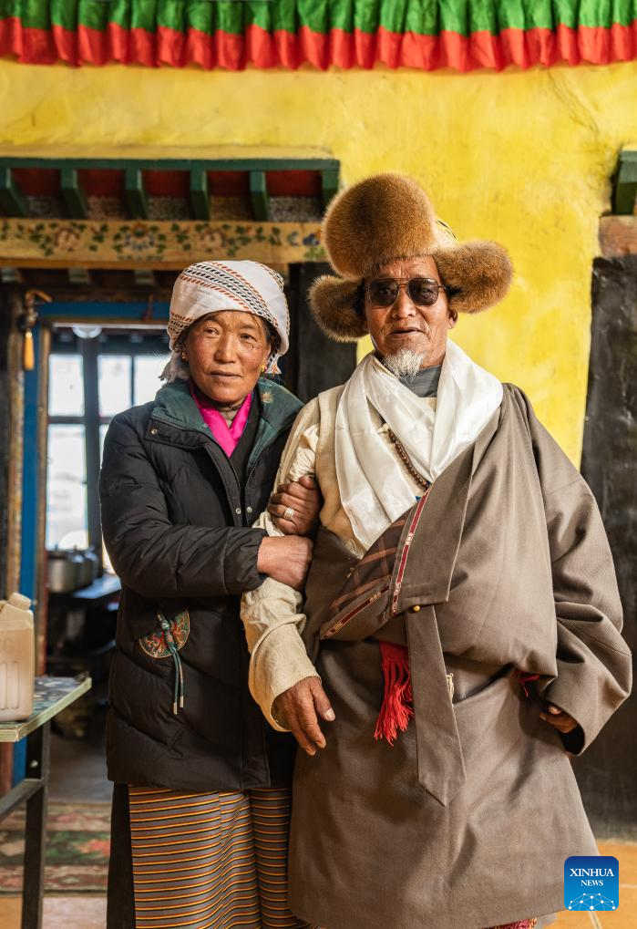 Wangchen (z prawej) i jego rodzina pozują do zdjęcia w domu w południowo-zachodnim Tybetańskim Regionie Autonomicznym [Xizang] w Chinach, 16 marca 2025 r. (Xinhua/Tenzin Nyida)