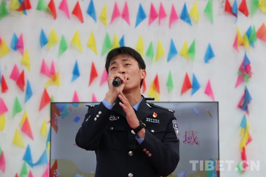 Na zdjęciu policjant z posterunku kontroli granicznej w Cuonie wykonujący na wieczornicy tybetańską piosenkę „Nangqian”.