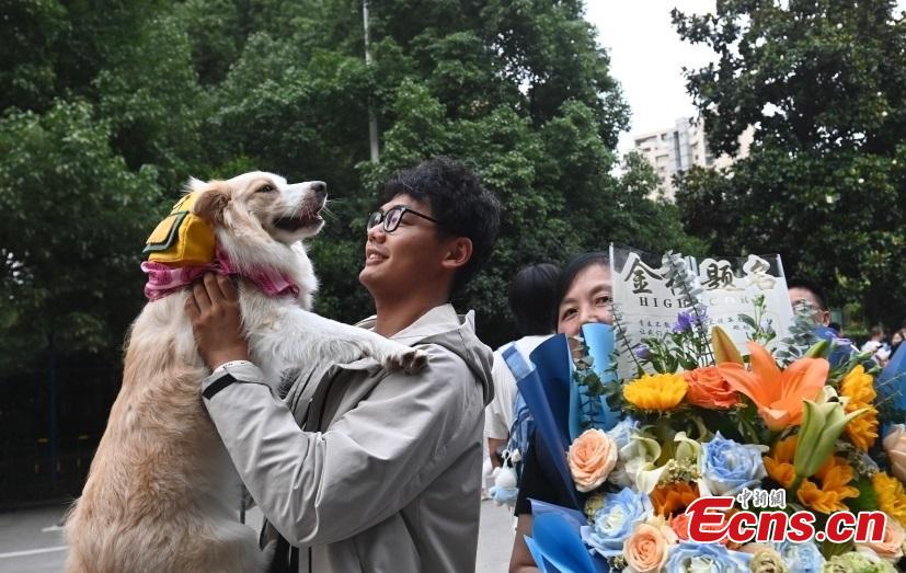Abiturient wita się ze swoim psem po egzaminie, który odbywał się w Szkole Średniej nr 8 w Hefei w prowincji Anhui - 9 czerwca 2025 r. (Foto:China News Service/Han Suyuan).