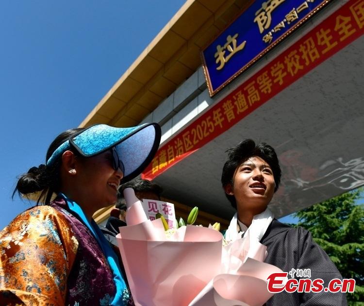 Mama wręcza synowi bukiet kwiatów po egzaminie GAOKAO, który odbywał się w Szkole Średniej w Lhasie Middle School w chińskim Tybetańskim Regionie Autonomicznym [Xizang] - 9 czerwca 2025 r. (Foto:China News Service/Li Lin)