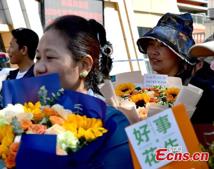 Rodzice czekają z bukietami na swoje dzieci po egzaminie GAOKAO, który odbywał się w Szkole Średniej w Lhasie Middle School w chińskim Tybetańskim Regionie Autonomicznym [Xizang] - 9 czerwca 2025 r. (Foto:China News Service/Li Lin)