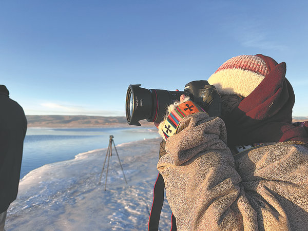 Dorje Tsomo, opiekunka ekologiczna ze Stacji Ochrony Ekologicznej Quanwan Biura Zarządzania Obszarem Krajobrazowym Jeziora Qinghai, fotografuje jezioro Qinghai. [Zdjęcie udostępnione China Daily].