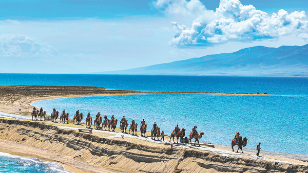 Pośród zapierających dech w piersiach krajobrazów turyści jeżdżą na wielbłądach. [Zdjęcie udostępnione China Daily]