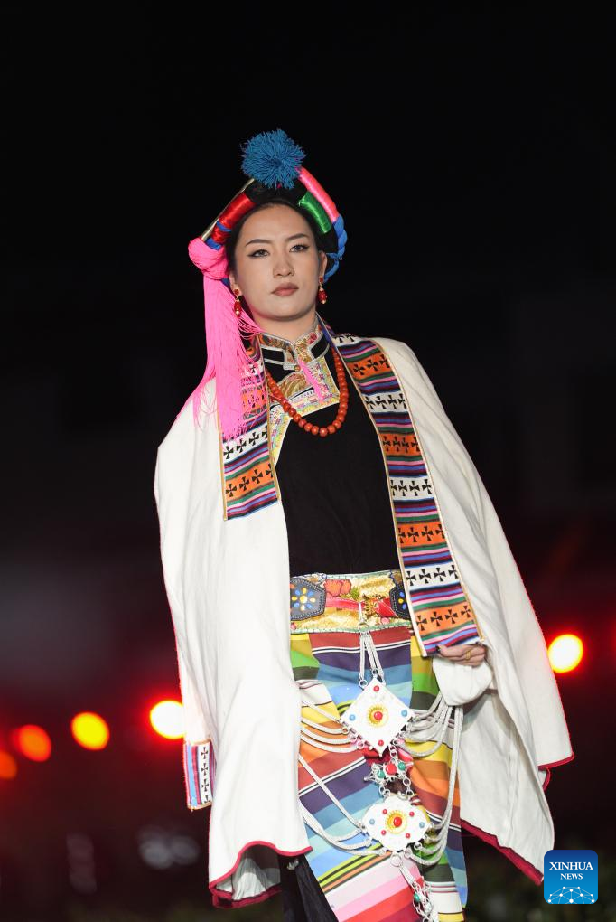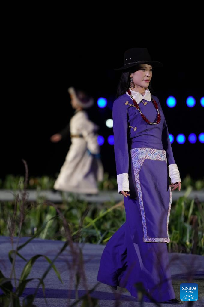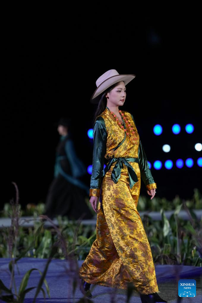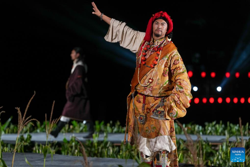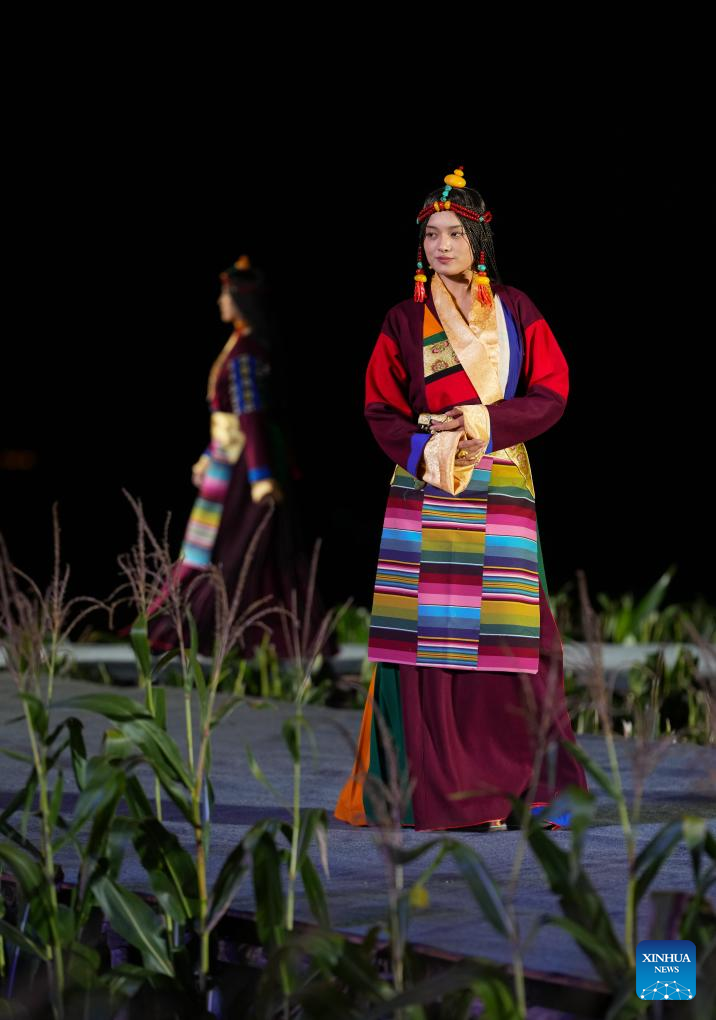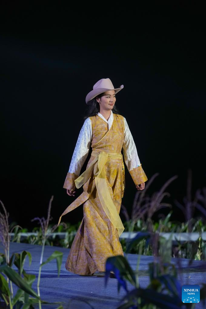 0 września 2025 r. Kobieta prezentuje tradycyjny strój tybetański na pokazie strojów tybetańskich w wiosce Zhongde w powiecie Xiangcheng, w Tybetańskiej Prefekturze Autonomicznej Ganzi, w prowincji Syczuan w południowo-zachodnich Chinach. Pokaz, łączący tradycję z nowoczesnością, odbył się w sobotę na polu kukurydzy. (Foto: Xinhua/Jiang Hongjing).