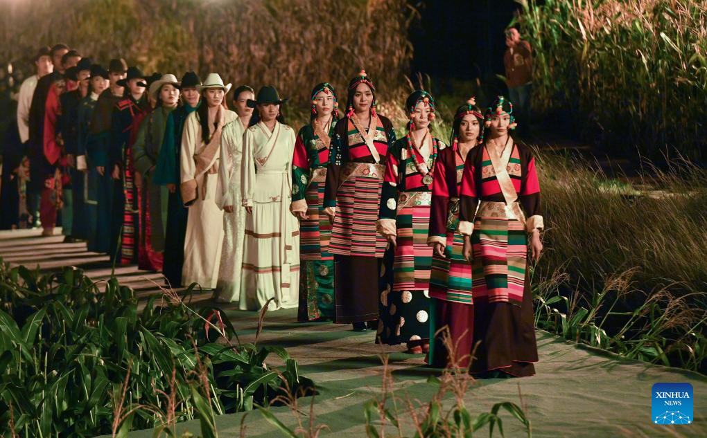 20 września 2025 r. Modele - zwykli młodzi mężczyźni prezentują tradycyjne stroje tybetańskie na pokazie strojów tybetańskich w wiosce Zhongde w powiecie Xiangcheng, w Tybetańskiej Prefekturze Autonomicznej Ganzi, w prowincji Syczuan w południowo-zachodnich Chinach. Pokaz, łączący tradycję z nowoczesnością, odbył się w sobotę na polu kukurydzy. (Foto: Xinhua/Jiang Hongjing).