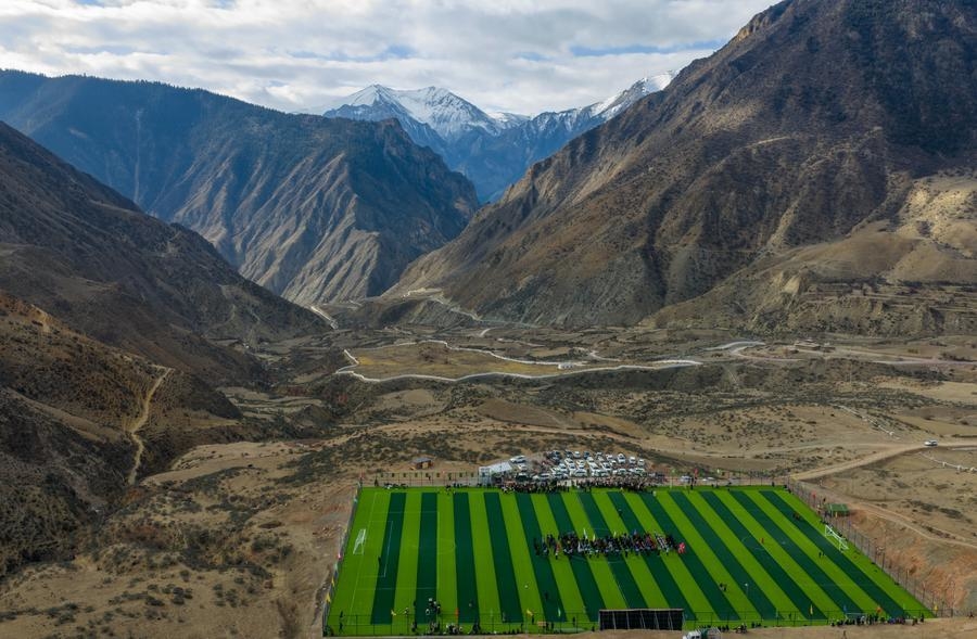 Zawodnicy wszystkich drużyn wchodzą na stadion na ceremonię otwarcia turnieju o Puchar Nowego Roku, który odbył się we wsi Marri położonej powiecie Lhorong w prefekturze Qamdo w Tybetańskim Regionie Autonomicznym [Xizang], 26 stycznia 2026 r. (Foto: Xinhua/Jiang Fan).