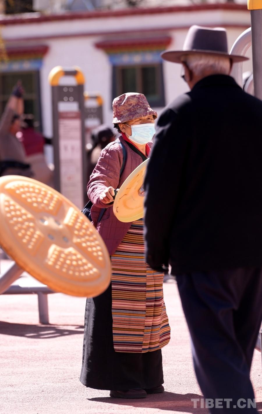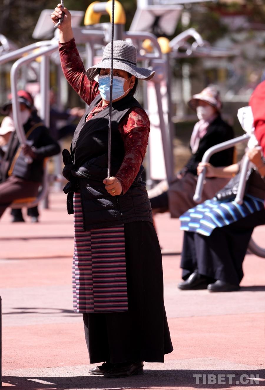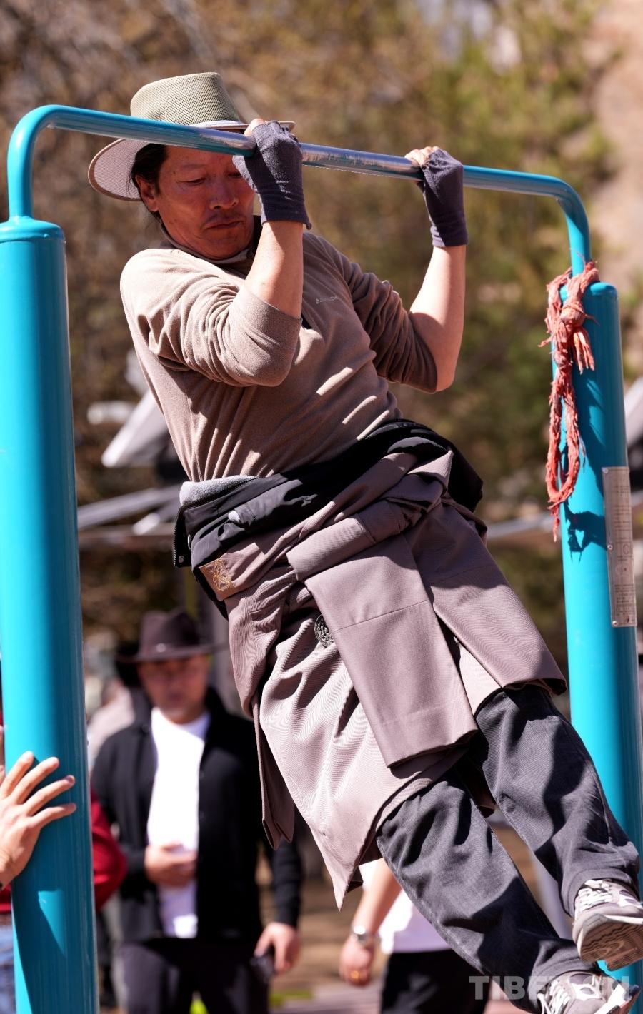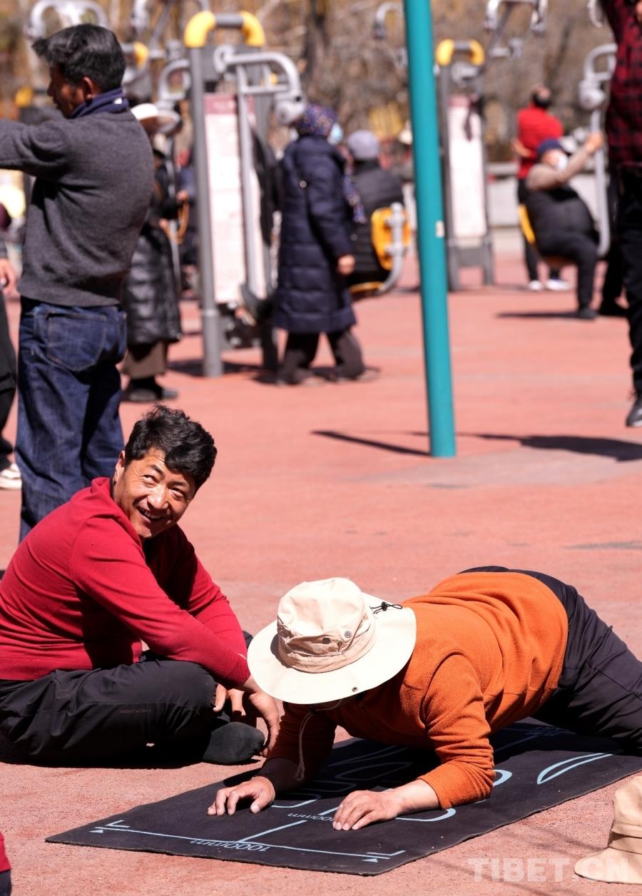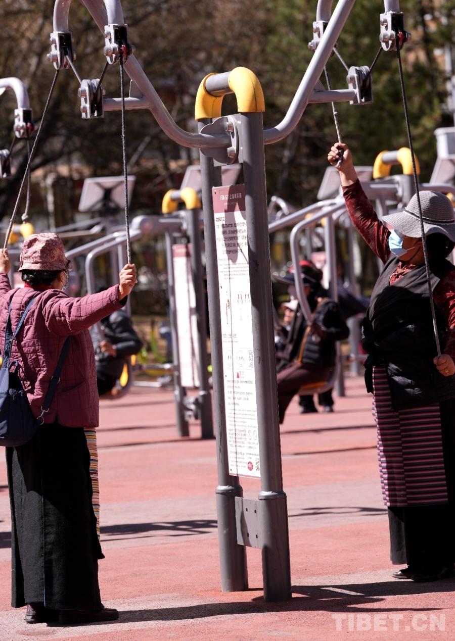 W parku Dzongyab Lukhang, położonym u stóp Pałacu Potala w Lhasie, mieszkańcy aktywnie ćwiczą w plenerowej strefie fitness, czerpiąc przyjemność z ćwiczeń.