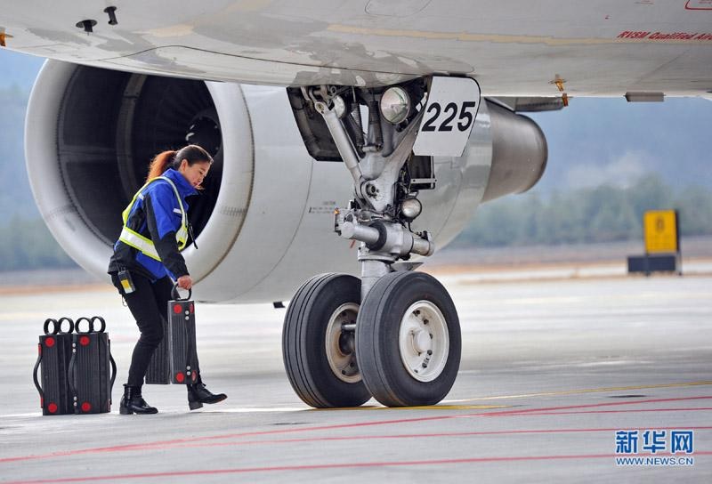 Maria przenosi specjalną klamrę do zablokowania kół samolotu. [Photo / Xinhua]