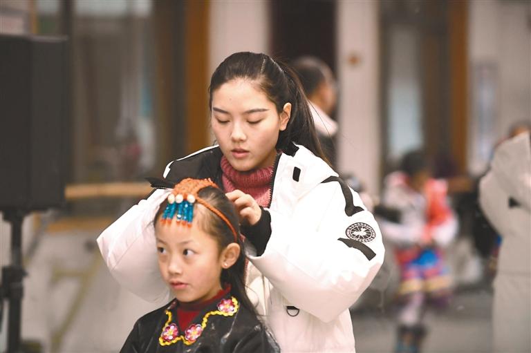 Nauczycielka tańca czesze młodą tancerkę przygotowując ją do występu, 5 stycznia 2018 - Muzeum Sztuki Masowej Tybetańskiego Regionu Autonomicznego w Lhasie