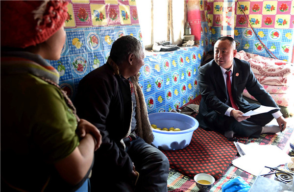 Dwujęzyczny sędzia Tsering Wangyel (z prawej) wyjaśnia procedury prawne Tybetańczykom w okręgu Xiahe, tybetańskiej autonomicznej prefekturze Gannan, w prowincji Gansu.