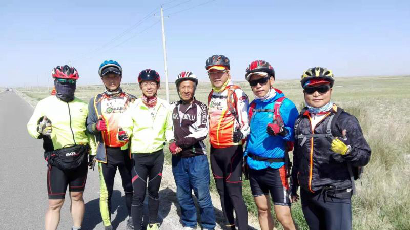 Sun Lin, obecnie w wieku 69 lat (w środku) pozuje do zdjęcia z entuzjastami kolarstwa podczas podróży do Dunhuang w prowincji Gansu w lipcu 2019 r. (Zdjęcie udostępnione dla chinadaily.com.cn)