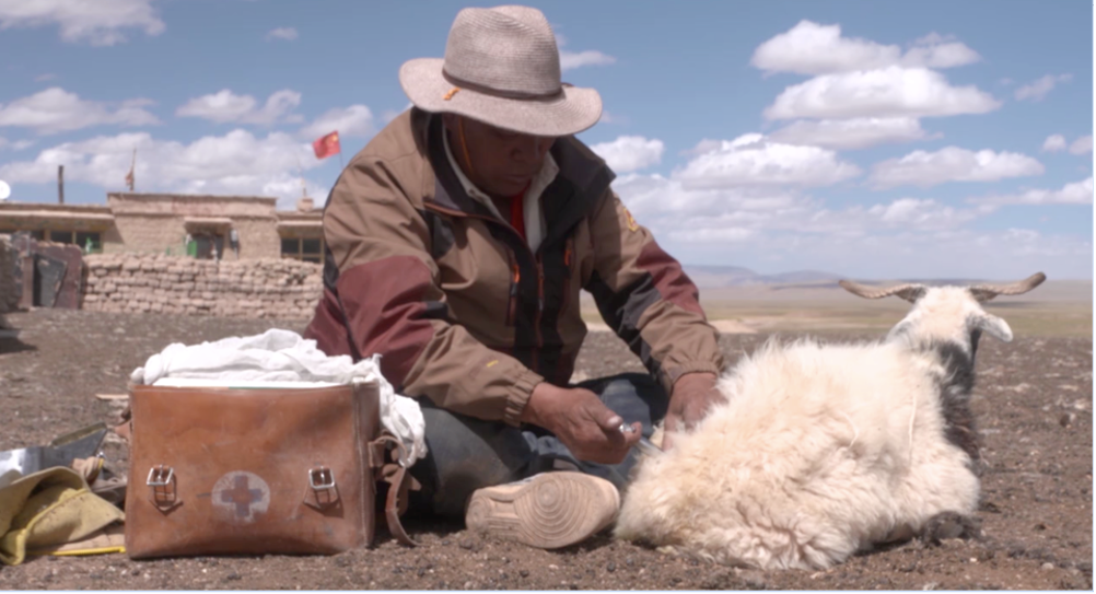 Gagya Dalmang leczy ranną owcę.[Foto: CGTN]